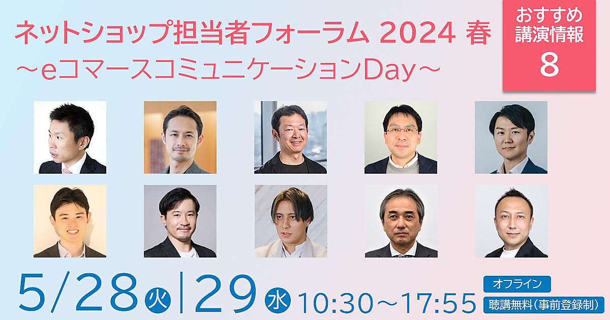 5月28日(火)+29日(水)に開催する「ネットショップ担当者フォーラム 2024 春」(東京・渋谷でオフライン開催)には、赤ちゃん本舗、ジュピターショップチャンネル、良品計画、マドラス、ユナイテッドアローズ、シップスといった企業が登壇。「ファンマーケティング」「組織の横連携成功の秘訣」「メーカーEC」などのテーマについて、企業の責任者などが講演します。25講演すべて無料で聴講できます。