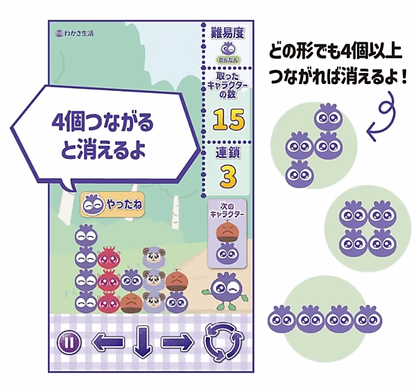 ゲームは「かんたん」「ふつう」「むずかしい」の3つの難易度を用意。難易度が上がるとキャラクターが上から落ちてくるスピードが上がる。消したキャラクターの数に応じて「玄人」「名人」「達人」と特典のランクを設けている。