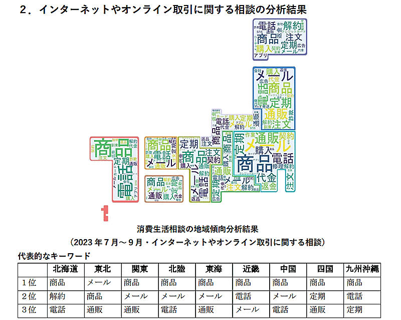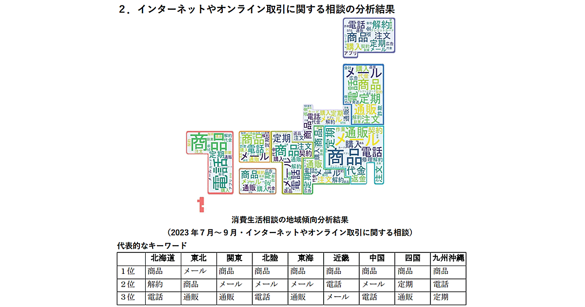 オンライン取引全体の傾向としては、全国的に意図しない定期購入に関する相談が多かった。副業サイトに関する解約や返金に関する相談も多い。関東地区と近畿地区などでは、ECサイトで購入した商品が不良品や粗悪品であったため修理・返品・交換などを求めたが応じれもらえないといった相談も多く見られたとしている。