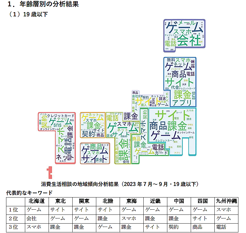 消費者庁は同年代の全国共通で多かった相談事例として、オンラインゲームの課金による高額請求に関するものが多く、18歳未満が行った課金について未成年者の契約取消権の行使を希望する保護者からの相談も多いという。地域傾向としては東北と北陸で副業サイトでの高額課金に関する相談が多かったという。