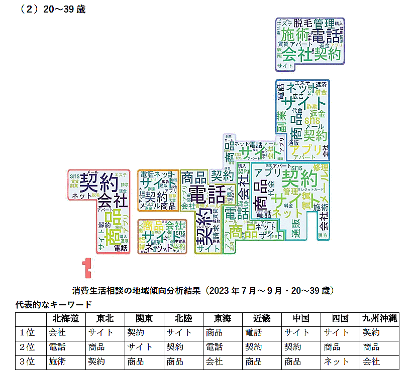 消費者庁による解説では、「20~39歳」では、全国的に多かった相談事例として副業サイトの解約や返金に関する相談、ECサイトで購入した商品が届かないという内容、意図しない定期購入に関する相談をあげた。地域別では、一部地区で美容系サービスの提供事業者倒産に伴う解約・返金に関する相談が多かったという。