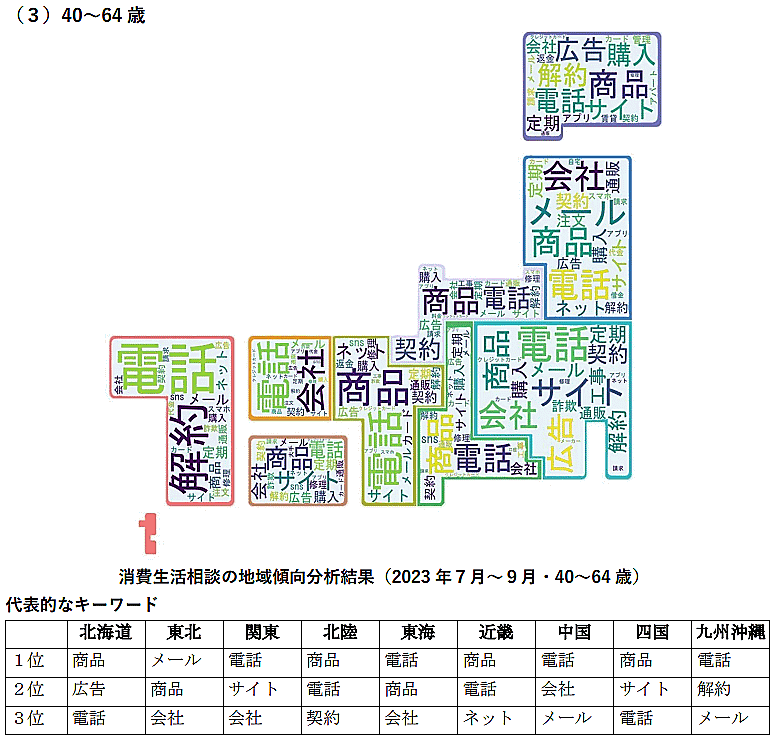 「40~64歳」では全国的に意図しない定期購入における相談が多かった。中国地区では大手電話会社の社員を名乗る者からの未納料金の支払いを求める電話があったことの相談が目立った。九州・沖縄地区では、携帯電話会社の乗換をしたが以前の携帯電話会社から料金請求が続いているといった電話料金に関する相談も多く見られたという。