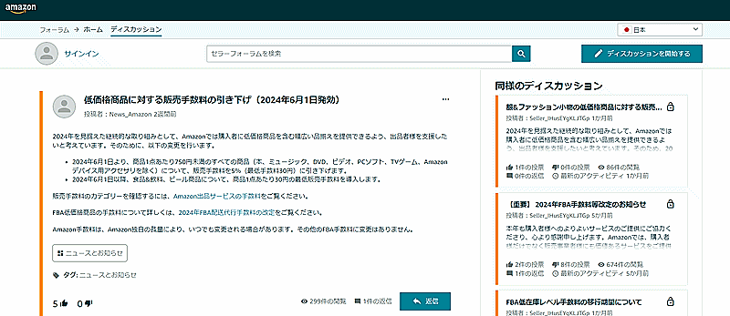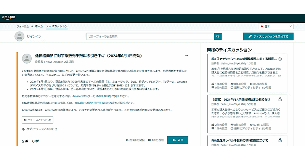 Amazon、750円未満商品の販売手数料を5%に引き下げ。2500円以下のアパレルは12%→8%に変更済