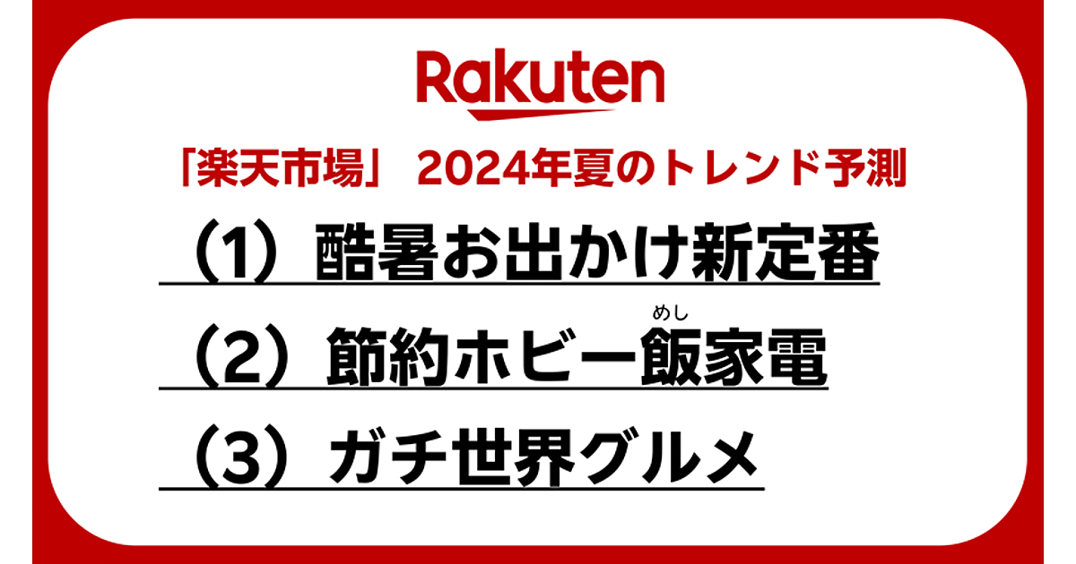 楽天グループは「『楽天市場』2024年夏のトレンド予測」を発表し、①酷暑お出かけ新定番②節約ホビー飯家電③ガチ世界グルメ――の3キーワードに関連した商品に注目が集まると予測した。