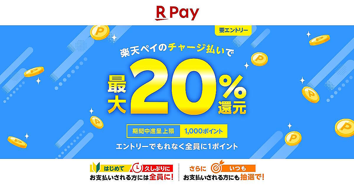 キャンペーン期間中にエントリーし、「楽天ペイ」アプリで「楽天キャッシュ」によるコード決済をすると、最大20%分の「楽天ポイント」を還元する。