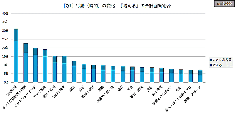 猛暑の影響で行動が「増える」と回答した項目は、「在宅時間」が最多で31.0%。「ネット配信動画の視聴」が22.7%、「ネットショッピング」が20.1%、「テレビ視聴」が19.1%で続いた。