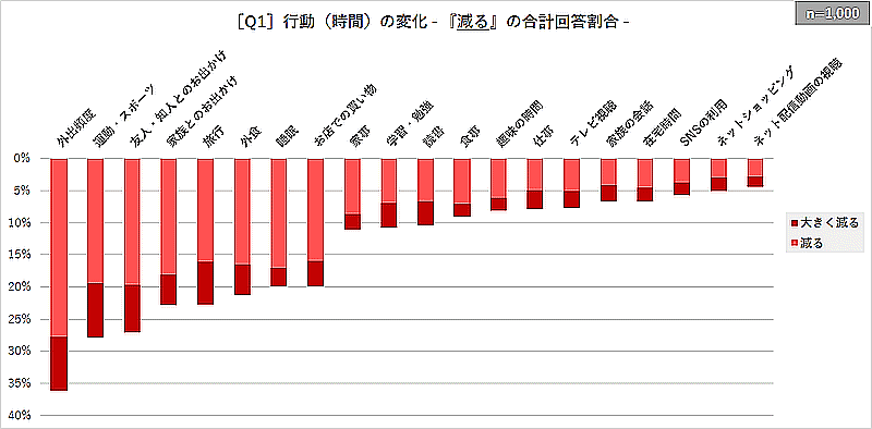 一方、猛暑の影響で行動が「減る」と回答したのは、「外出頻度」が36.1%。次いで「運動・スポーツ」が27.9%、「友人・知人とのお出かけ」が27.1%だった。