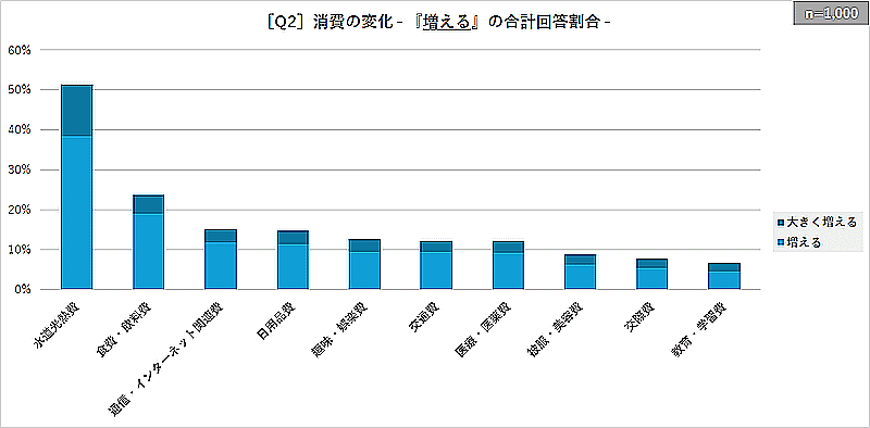 なお、消費の変化について、[増える]の割合は「水道光熱費」(51.4%)「食費・飲料費」(23.7%)が上位に。「減る」の割合は、「交際費」(19.6%)「交通費」(15.5%)「被服・美容費」(10.8%)などが比較的高かった。