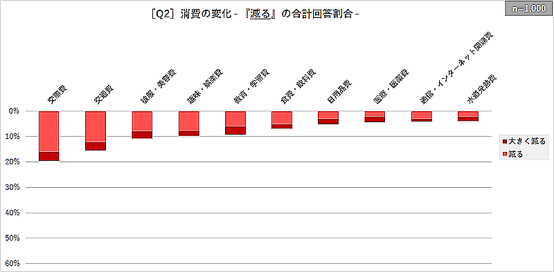 「変わる」の割合は、「水道光熱費」(55.4%)「食費・飲料費」(30.6%)「交通費」(27.7%)「交際費」(27.4%)が上位だった。