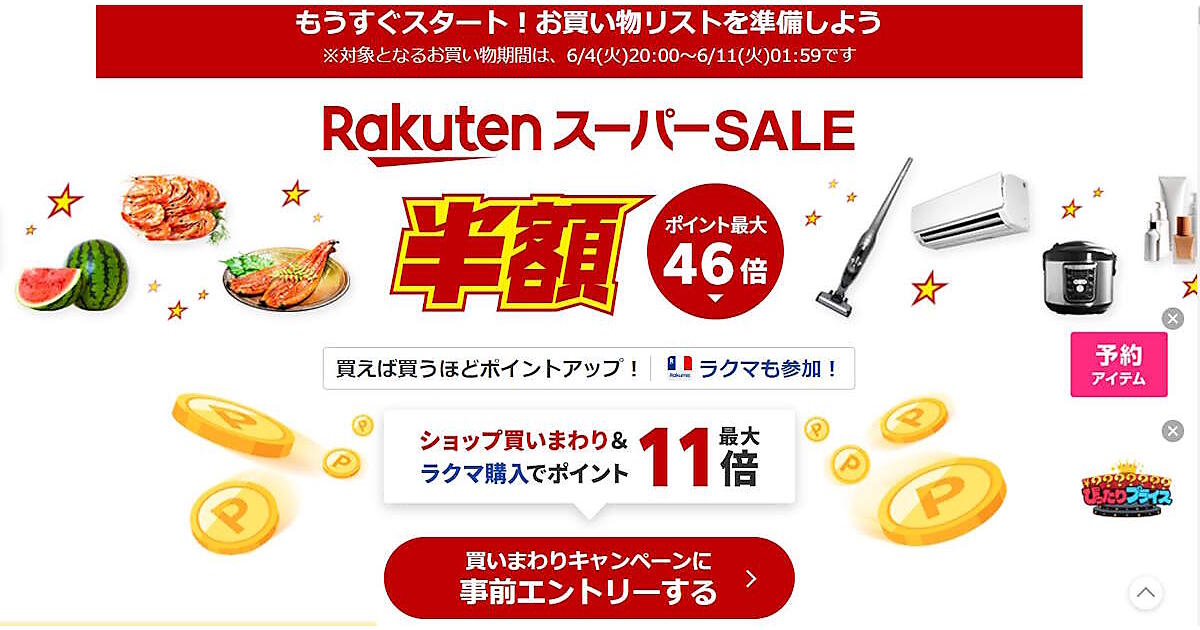 楽天グループは6月4日(火)の20時から、「楽天市場」で「RakutenスーパーSALE」をスタートする。ショップの買い回りで付与する楽天ポイントは最大46倍。フリマアプリ「楽天ラクマ」もセールの対象。