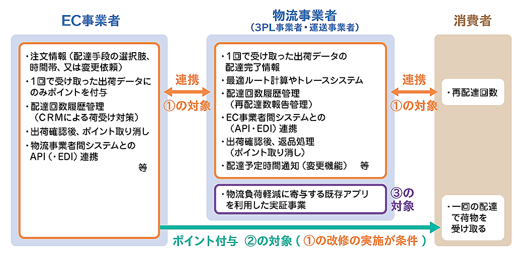 「再配達率削減システム改修」「再配達率削減ポイント付与」「物流負荷軽減アプリ実証事業」を補助する。