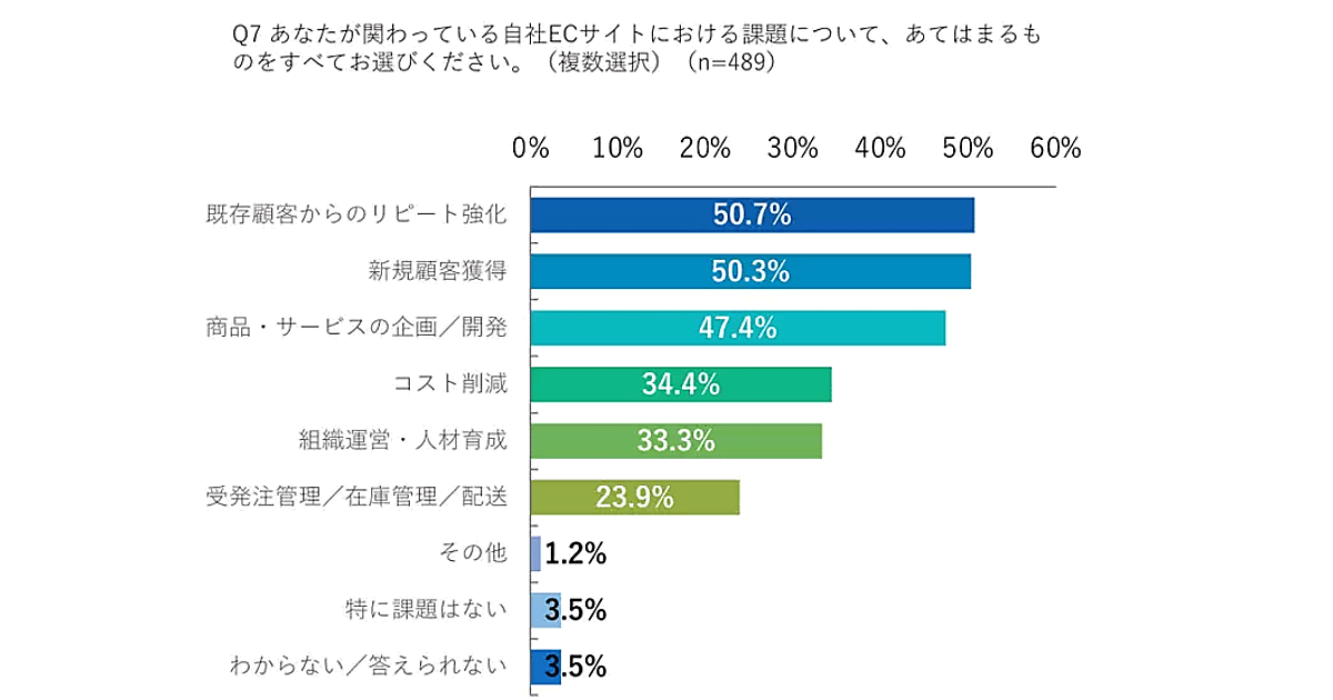 ECサイト向けマーケティングオートメーション・CRMツール「EC Intelligence」の開発・提供を手がけるシナブルは、EC担当者に対して自社ECサイトにおける課題を調査し、その結果をまとめた。489人のEC担当者が回答した。