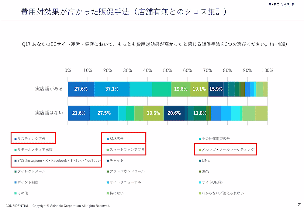 実店舗がないEC専業の担当者ではと、「SNS広告」が27.5%、「リスティング広告」が21.6%、「SNS(Instagram・X・Facebook・TikTok・YouTube」が20.6%だった。