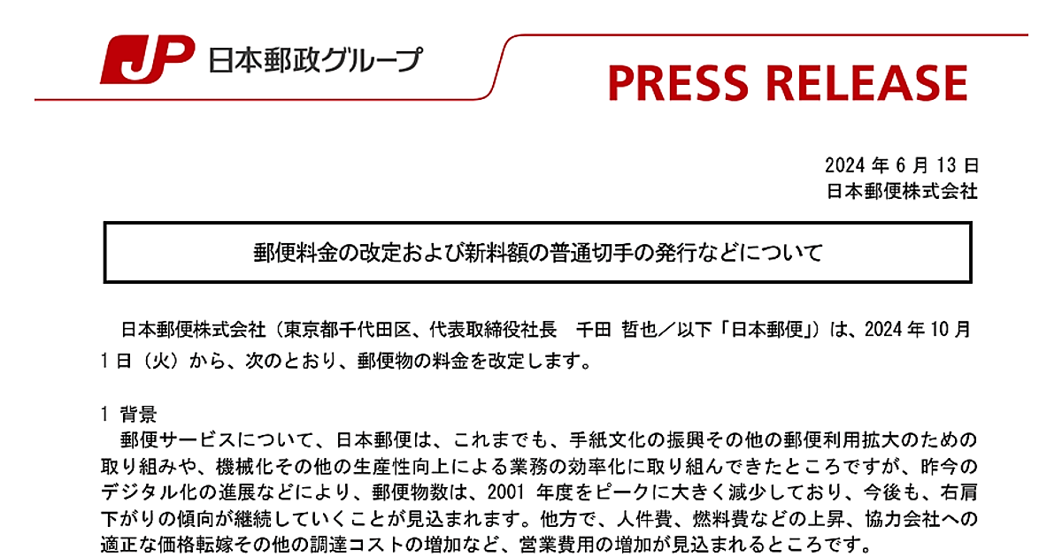 こうしたなか、2024年6月13日に25グラム以下の定形郵便物の上限額を定めている郵便法施行規則の規定が改正されたことを受け、郵便料金の改定を実施することにした。