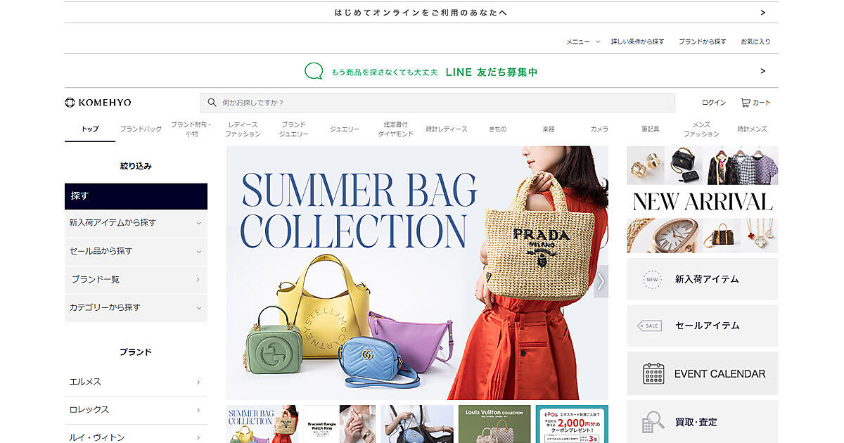「KOMEHYO ONLINE」ではラグジュアリーブランドの中古品をメインに、バッグ、ジュエリー、ファッション、財布など約8万点近くの商品を販売している。