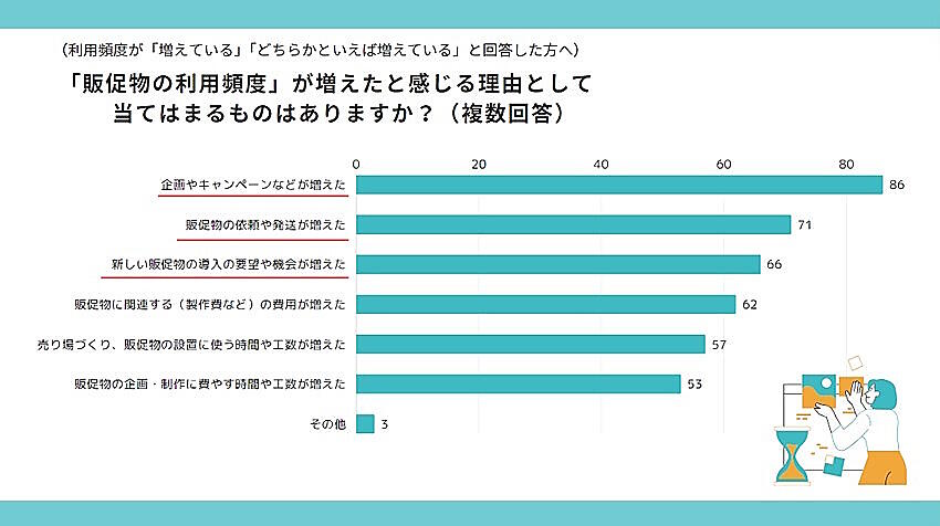 「利用頻度が増えた」と回答した担当者に対して「増えたと感じる理由」を聞いたところ、「企画やキャンペーンなどが増えた」が最多。「販促物の依頼や発送が増えた」「新しい販促物の導入の要望や機会が増えた」が続いた。