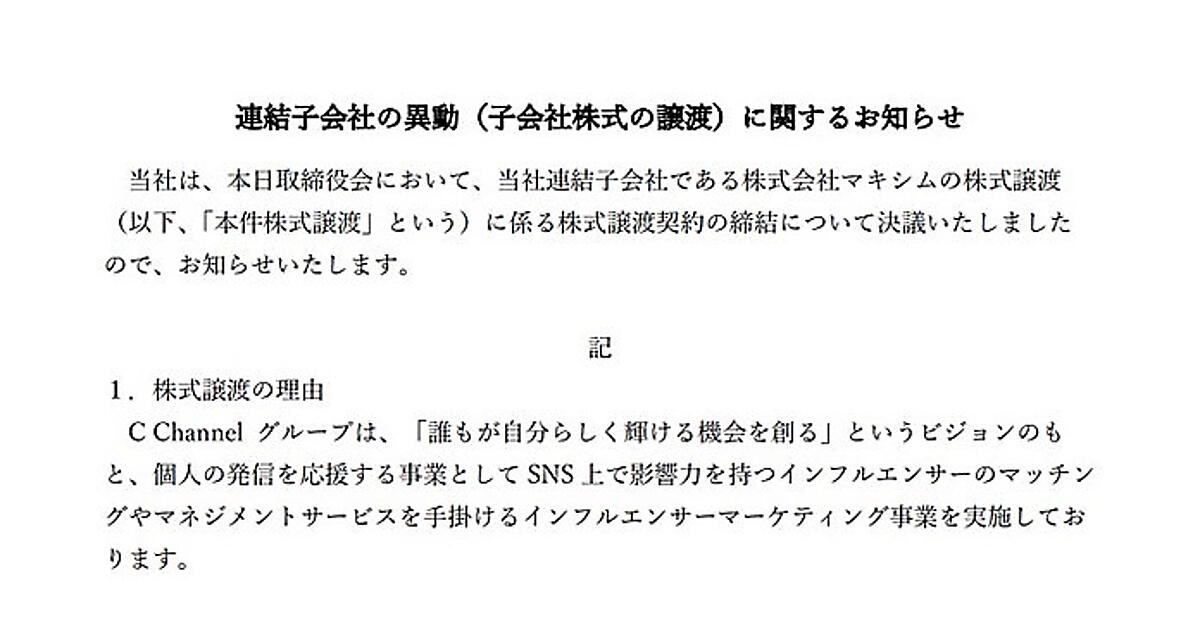 C Channelは2017年にマキシムを子会社化。保有する株式70.7%(53株)をフジスターに譲渡する。マキシムの2024年3月期における売上高は前期比7.2%減の39億9200万円、営業利益は900万円(前期は9100万円の赤字)、経常利益は600万円(前期は9100万円の赤字)、当期純利益は600万円(前期は9100万円の赤字)だった。