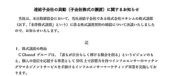 なお、マキシムを巡っては2020年10月にC Channelからベルーナへ16億5000万円での売却を発表したが、翌11月に中止を発表。クロージング条件が折り合わず株式譲渡契約の解除に至ったとしていた。