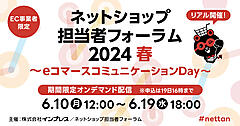 5/28+29に実施したネッ担編集部主催のECイベント「ネットショップ担当者フォーラム 2024 春 ~eコマース コミュニケーションDay~」(5月28日+29日)のオンデマンド配信をスタートしました。良品計画、アンカー・ジャパン、ヤッホーブルーイング、土屋鞄製造所、花王+味の素+キリンホールディングス、赤ちゃん本舗、ユナイテッドアローズ+シップス+オンワードなどが登壇し、ECビジネスで成功するヒントについての講演を「いつでも」「どこでも」聴講できます。ぜひイベントサイトをチェックしてください。申し込み期間は6月19日(水)16時00分まで。