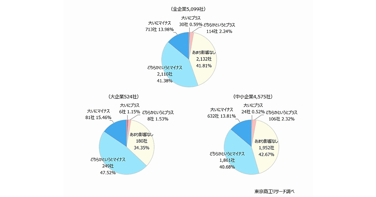 産業別で「マイナス」と回答したトップは卸売業の65.8%だった。各産業をつないで円滑な流通システムの構築を担う卸売業は、配送コスト上昇への対応や納品スケジュールの見直しを懸念する声が多い。建設業が64.1%、製造業が60.7%、運輸業が60.4%で続いた。