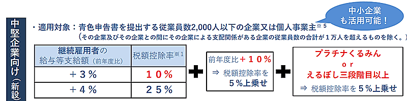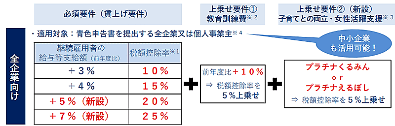 継続雇用者の給与等支給額が前年度比で3~7%増加した場合、増加率に応じて給与支給額の増加額の10~25%を税額控除する。加えて教育訓練費が同10%増の場合は控除率をさらに5%上乗せ、「プラチナくるみん」「プラチナえるぼし」を取得している場合は控除率をさらに5%を上乗せる。