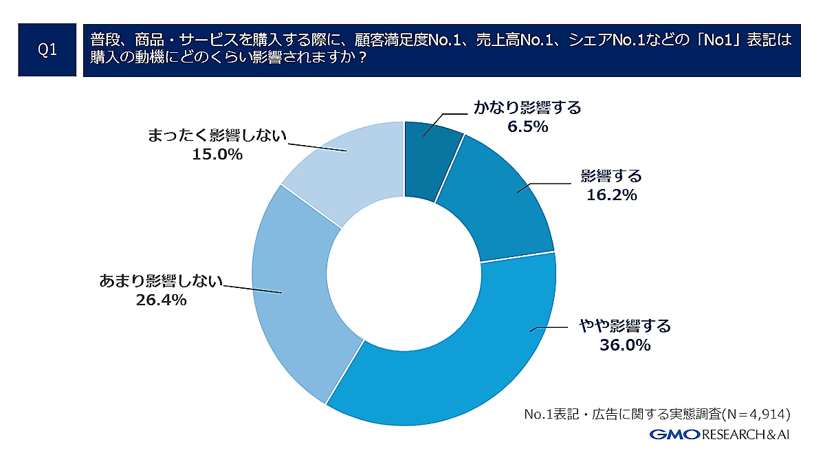 GMOインターネットグループで、インターネットリサーチ事業を展開するGMOリサーチ&AIが実施した広告の「No.1」表記に関する自主調査によると、「No.1」表記があることで約60%のユーザーが購入の動機に影響すると回答した。