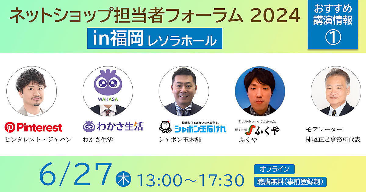 6月27日(木)に開催する「ネットショップ担当者フォーラム 2024 in福岡」は、Pinterest、わかさ生活、ふくや、シャボン玉本舗、元JADMA、Amazon、これからが登壇。5年ぶりに福岡でオフライン開催します!