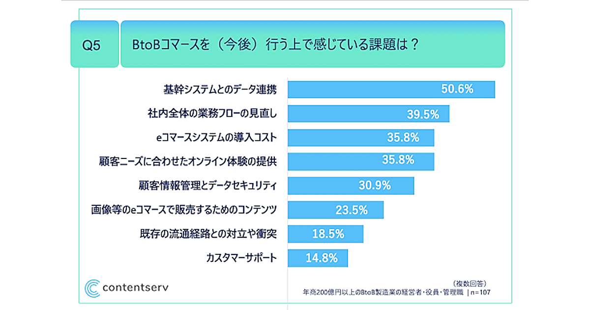 具体的な課題は、「基幹システムとのデータ連携」が最多で50.6%。「社内全体の業務フローの見直し」が39.5%、「eコマースシステムの導入コスト」が35.8%で続いた。