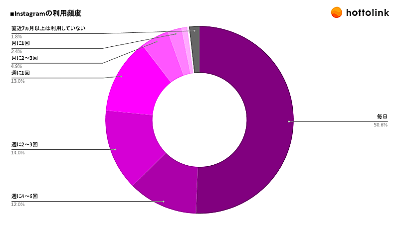 「毎日」が50.6%とダントツでトップ。頻度が多い順に「週に4~6回」12.0%、「週に2~3回」が14.0%、「週に1回」が13.0%となり、9割弱が週に1回以上Instagramと接している。