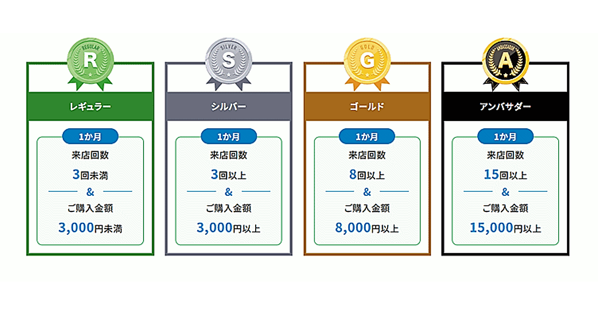 会員ランクは「レギュラー」「シルバー」「ゴールド」「アンバサダー」の4段階。月間の来店回数と合計購入金額によって翌月のランクを決定する。会員ランクは毎月リセット。「ファミペイ」の提示で計測するが決済方法は問わないとしている。レジ袋やたばこなど一部商品の購入はランク決定の月の購入総額の対象外となる。
