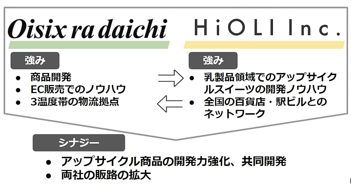 オイシックス・ラ・大地の商品開発、EC販売ノウハウ、3温度帯の物流拠点、HiOLIの乳製品領域でのアップサイクルスイーツの開発ノウハウ、全国の百貨店・駅ビルとのネットワークの強みを通じて、アップサイクル商品の開発力強化や共同開発、販路拡大といったシナジーを創出していく。