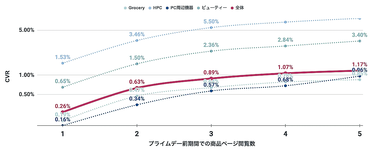 商品カテゴリ別で見てると、「プライムデー」の期間前に複数回商品ページを閲覧するほど注文率が高く推移していた。特に、Beauty、HPC(ヘルス&パーソナルケア)のCVRが高いのは、買い回りが多い商材のためだと推測。「事前に1回にとどまらず複数回商品ページを閲覧させることで、気になる商品として認識してもらうことも重要」(ウブン)