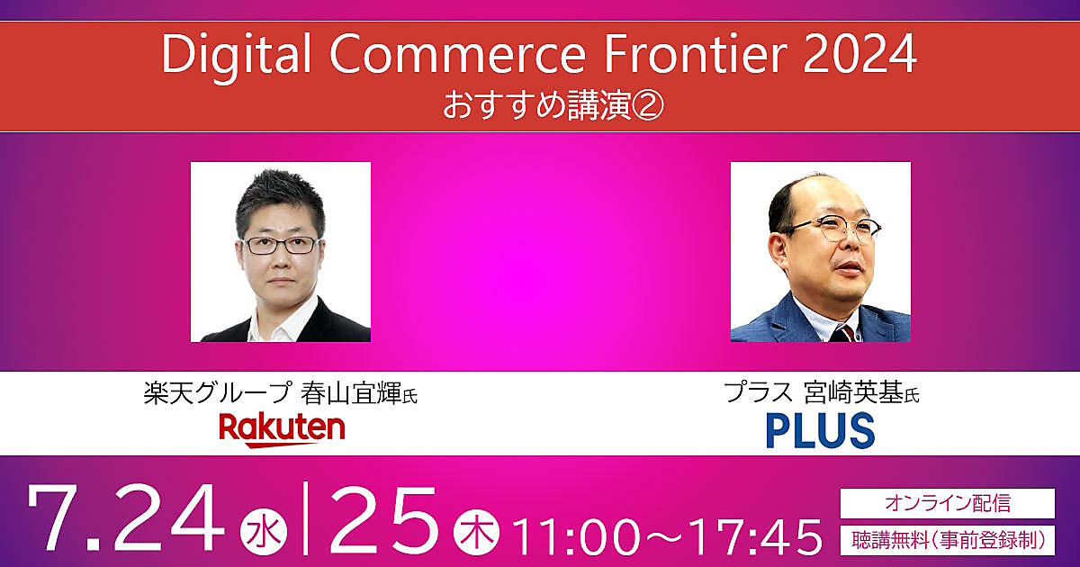 7月24日(水)+25日(木)に開催する「Digital Commerce Frontier 2024」(オンライン開催)は、AI+リテールメディアといった「Internet Retailing」、法人向け通販・ECやDXといった「BtoB-EC&DX」の2つの軸をテーマに、楽天グループのリテールメディア事例、TENTIALやパルによるAI活用、ミレージャパンのEC事業成功事例、プラスやコクヨによるBtoB-ECなど全19講演を用意しました。すべて無料で聴講できます。