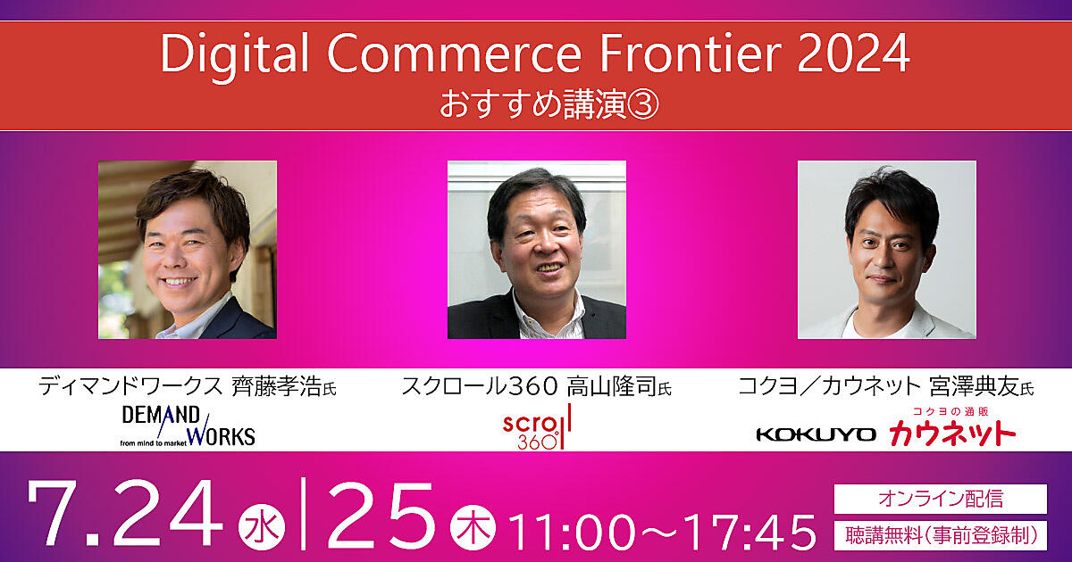 7月24日(水)+25日(木)に開催する「Digital Commerce Frontier 2024」(オンライン開催)は、AIやリテールメディアなどの「Internet Retailing」、DXや法人向けECなどの「BtoB-EC&DX」の2つの軸をテーマに、中国発EC「SHEIN」のサプライチェーン大解説、プラスやコクヨによるBtoB-EC、AmazonやTENTIAL、パルによるAI活用、楽天グループのリテールメディア事例など全19講演を用意しました。すべて無料で聴講できます。