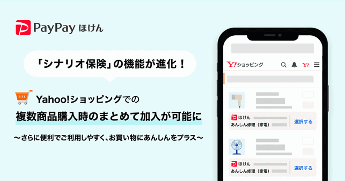 機能強化したのは、「Yahoo! JAPAN」のサービス上でユーザーのニーズに沿った最適な保険商品を提案する「PayPayほけん シナリオ保険」。PayPay保険サービス、Zフィナンシャルが提供。新品家電・中古スマホ・中古家電向けの「あんしん修理」、家具の「あんしん修理」「あんしん自転車」、車・タイヤの「あんしん修理」といった「Yahoo!ショッピング」で購入した商品に関して保険に加入できるサービスを展開している。