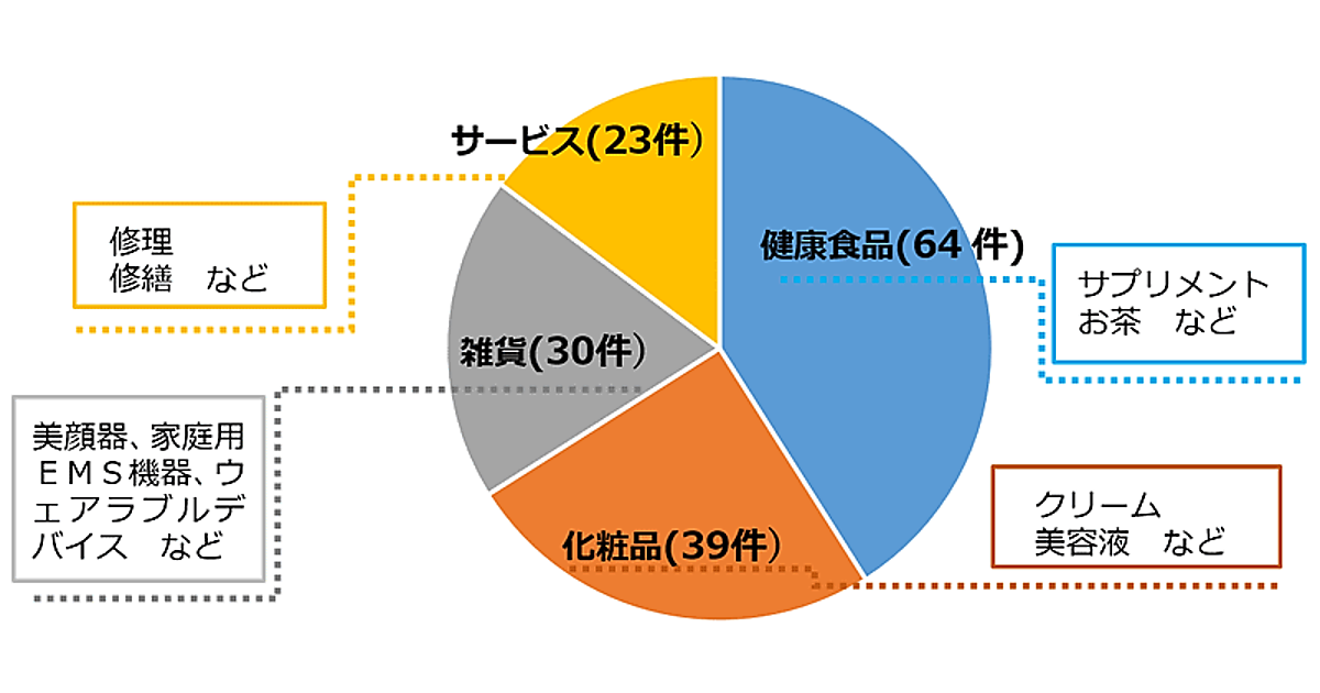 商品サービス別の詳しい指導件数の内訳は、健康食品が64件、化粧品が39件、雑貨が30件、修理・修繕などサービスが23件だった。