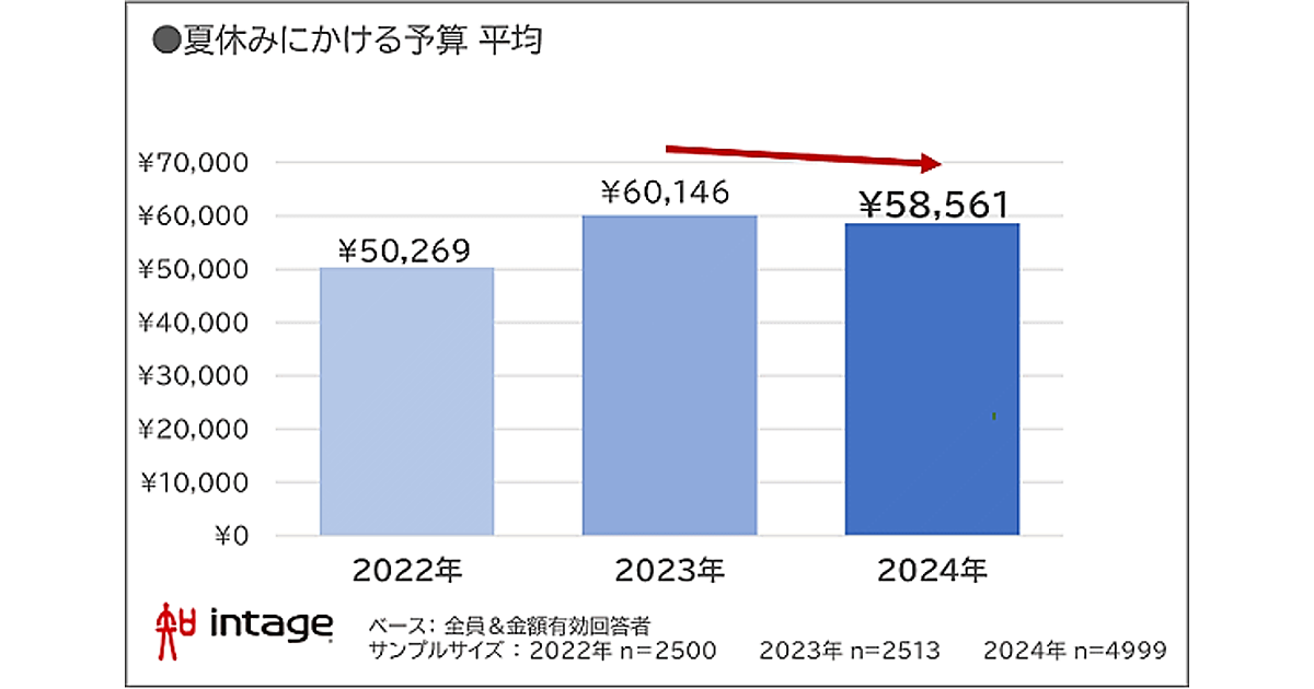 インテージが実施した2024年の夏休み期間(7月13日~9月30日)における過ごし方の調査によると、予算総額の平均金額は5万8561円で前年比2.6%減、金額ベースで同1585円のマイナスとなった。