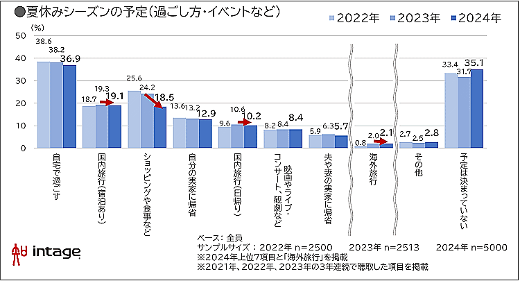 夏休みシーズンを過ごす予定(複数回答)については、「自宅で過ごす」が36.9%、「予定は決まっていない」が35.1%、「国内旅行(宿泊あり)」が19.1%、「ショッピングや食事など」が18.5%だった。このうち、「ショッピングや食事など」は前年比5.7ポイントの大幅な減少となった。