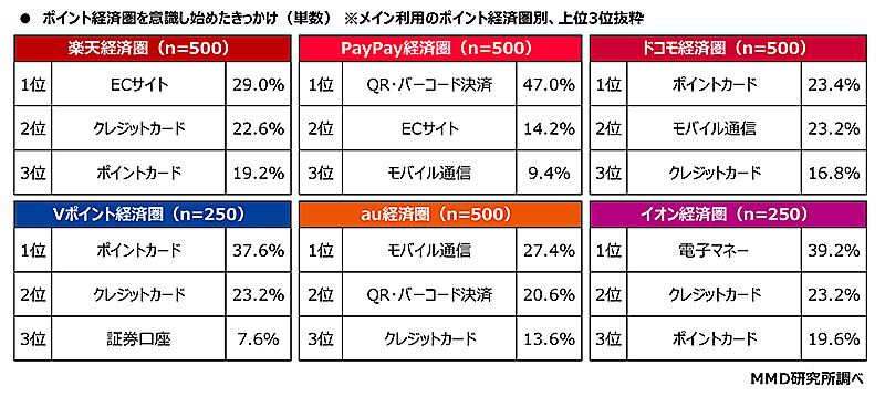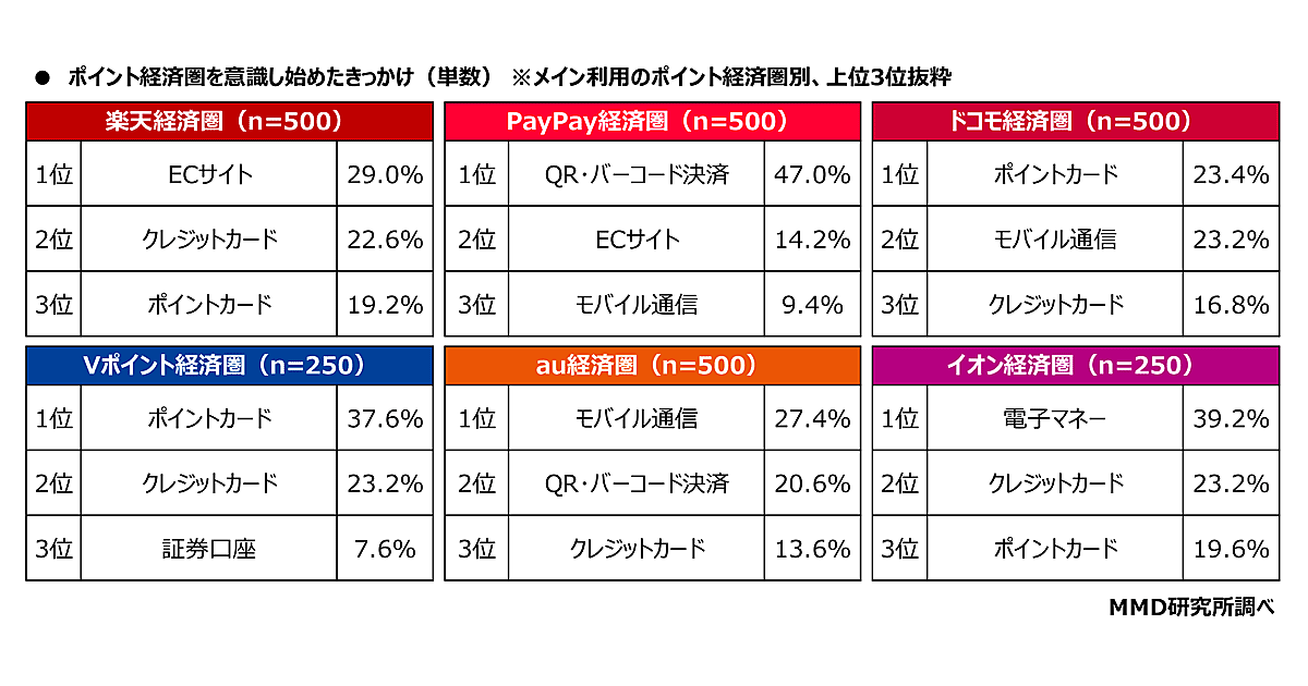 経済圏意識のきっかけ、楽天は「ECサイト」、ドコモとVポイントは「ポイントカード」