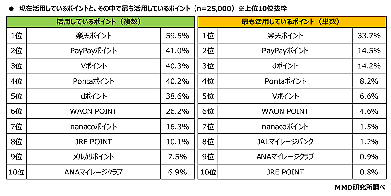 最も活用しているポイント上位は「楽天ポイント」「PayPayポイント」「dポイント」