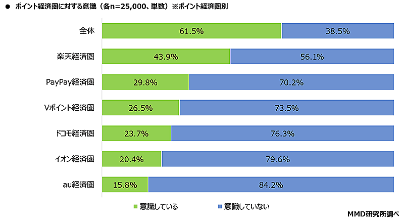 ポイント経済圏別に見ると、「意識している」割合が最も多いのは「楽天経済圏」(43.9%)、次いで「PayPay経済圏」(29.8%)「Vポイント経済圏」(26.5%)だった。
