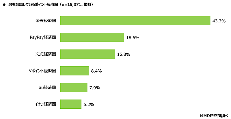 ポイント経済圏を意識しているユーザーに、最も意識している経済圏を聞いたところ、トップは「楽天経済圏」(43.3%)、次いで「PayPay経済圏」(18.5%)「ドコモ経済圏」(15.8%)だった。