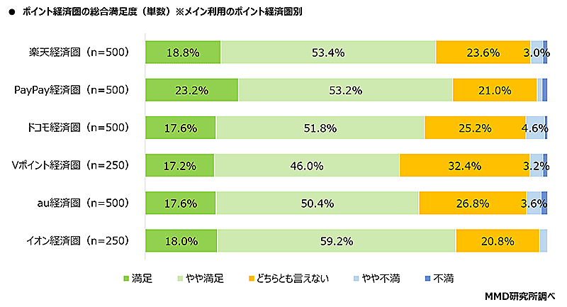 メイン利用している経済圏の総合満足度を聞いたところ、「満足」と「やや満足」を合わせて満足している割合は「イオン経済圏」(77.2%)がトップ。次いで「PayPay経済圏」(76.4%)「楽天経済圏」(72.2%)だった。