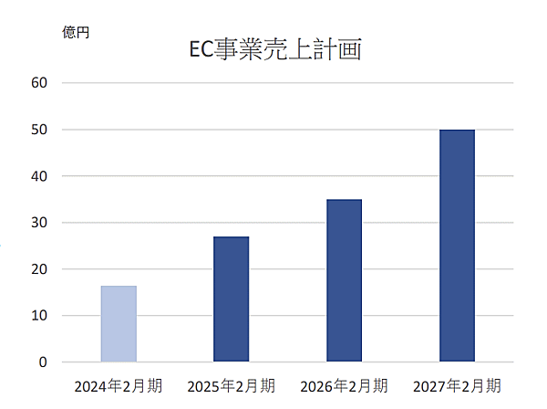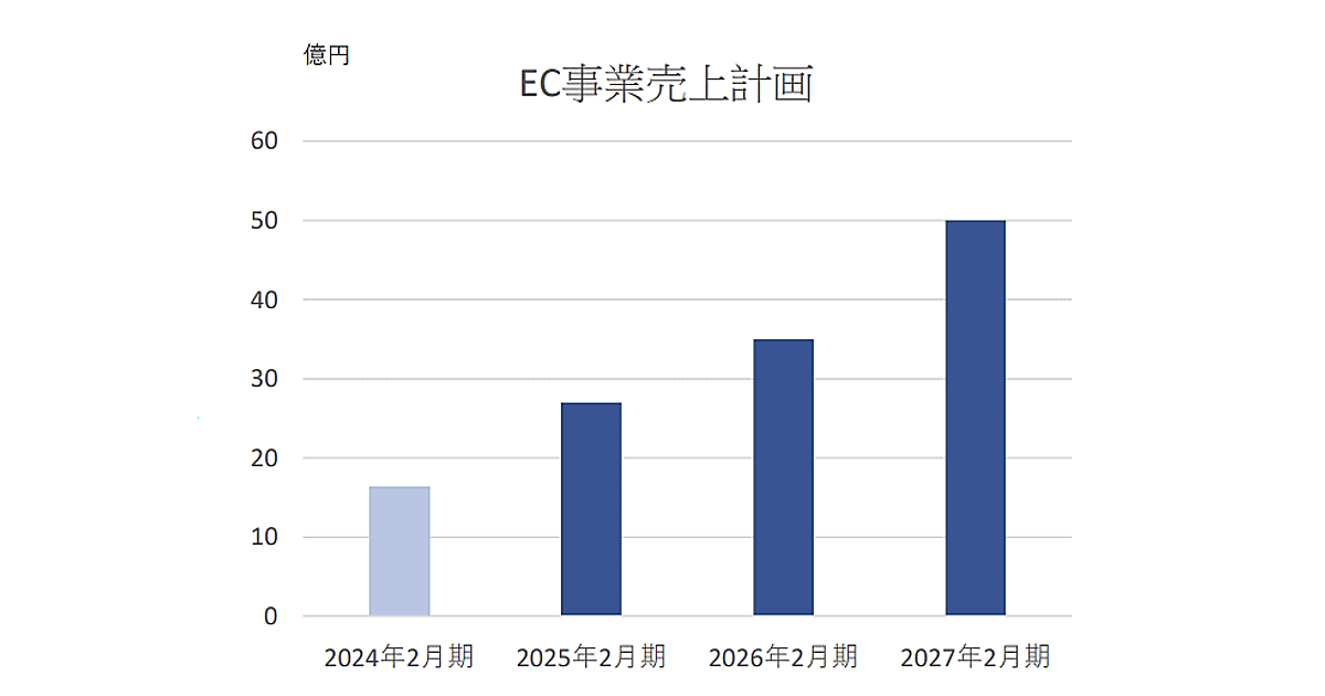 チヨダはEC事業の強化を進めており、今回の「au PAYマーケット」新規出店もその一環。2027年2月期のEC事業売上計画として50億円を掲げており、2024年2月期では営業区分別「EC・その他」の伸長率は143.2%で同期のEC売上高は約15億円だった。2025年2月期の重点施策においても、売チャネル拡大によるEC事業のブラッシュアップをあげている。