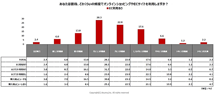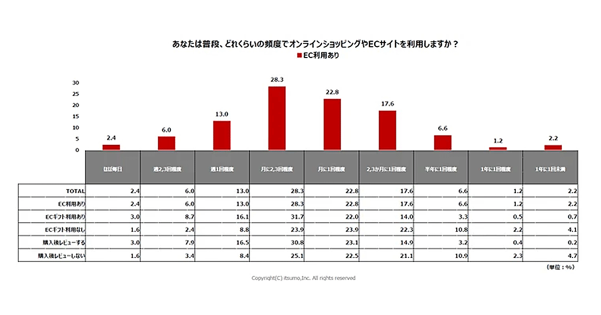 平均購入金額が月5000円未満のユーザーは、「ECギフト利用なし」(54.4%)「購入後レビューしない」(50.9%)などが過半数を超えている。しかし、月1万円未満のユーザーでは、「ECギフト利用あり」が59.7%、「購入後レビューあり」が62.7%となっており、ECでギフトを購入するユーザー、購入後にレビューをするユーザーは、利用頻度、購入平均金額が高い傾向にある。