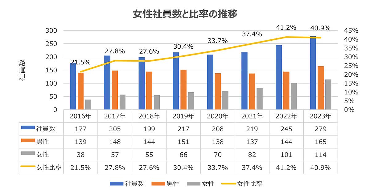 7月23日に公表した資料によると、2016年度から2023年度までの7年間で女性社員数は38人から114人に増加。女性社員比率は21.5%から40.9%まで高まった。