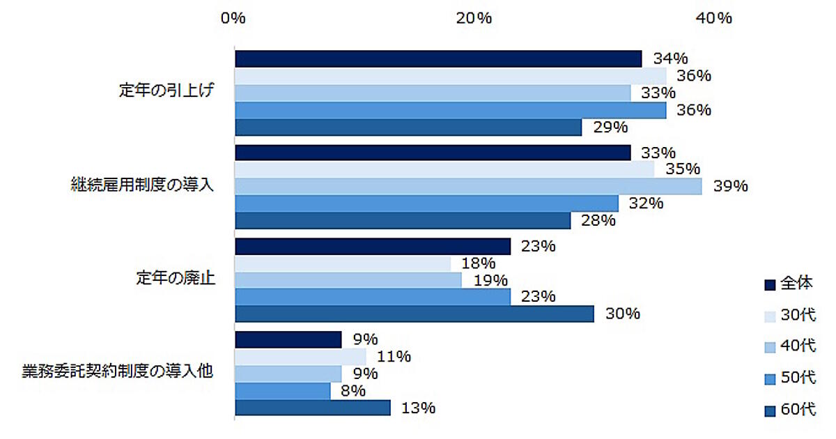 どのような措置を講じている企業に転職したいかについては、「定年の引上げ」の34%が最多で、「継続雇用制度の導入」が33%、「定年の廃止」が23%などとなっている。