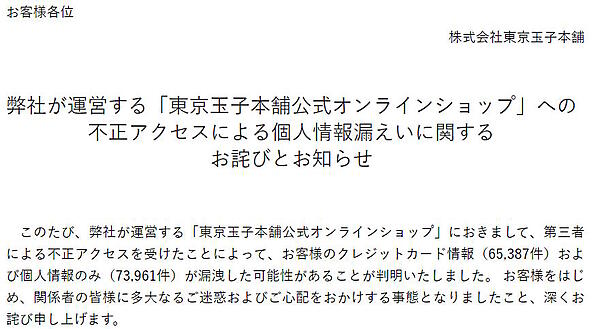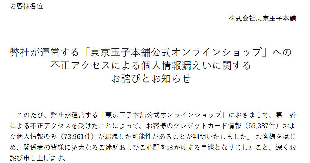 菓子の製造・販売を手がける東京玉子本舗は7月31日、自社ECサイト「東京玉子本舗公式オンラインショップ」が第三者による不正アクセスを受け、クレジットカード情報および個人情報が漏えいした可能性があると公表した。
