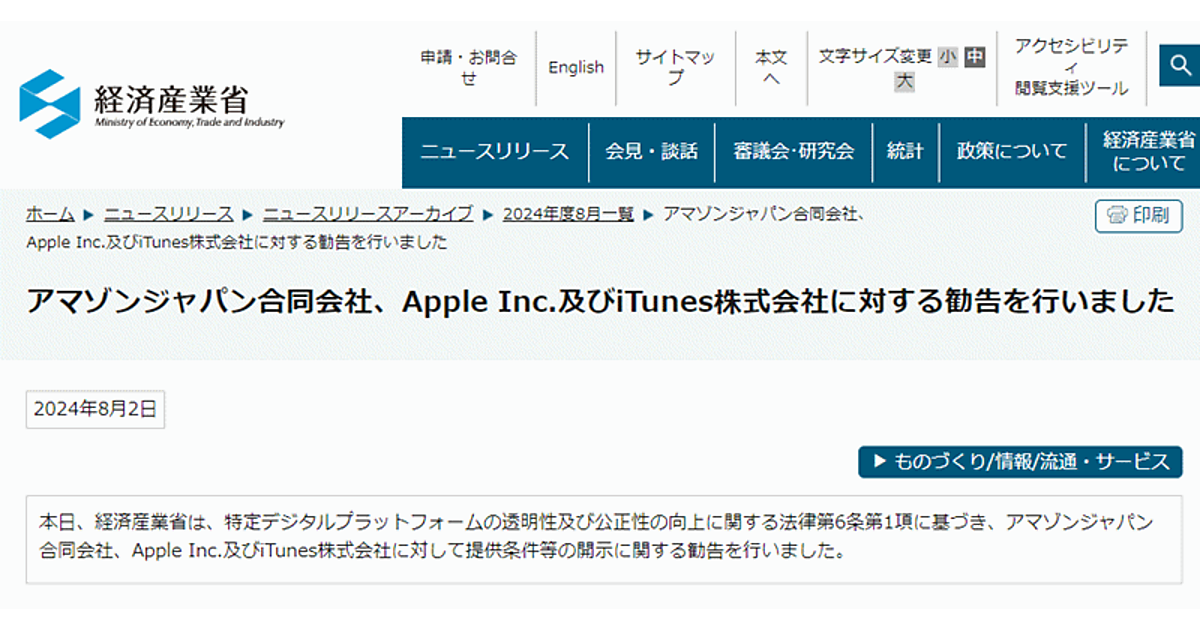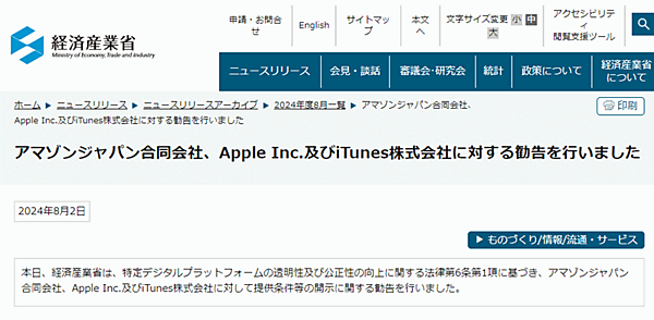 経済産業省は8月2日、「特定デジタルプラットフォームの透明性及び公正性の向上に関する法律」(プラットフォーム透明化法)に基づきアマゾンジャパン、AppleおよびiTunesに提供条件などの開示に関する勧告を行った。