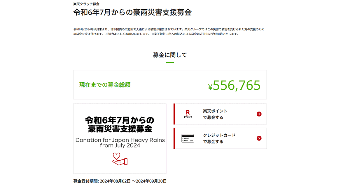 楽天グループは8月6日、インターネット募金「楽天クラッチ募金」で「令和6年7月からの豪雨災害支援募金」への寄付受付を開始した。